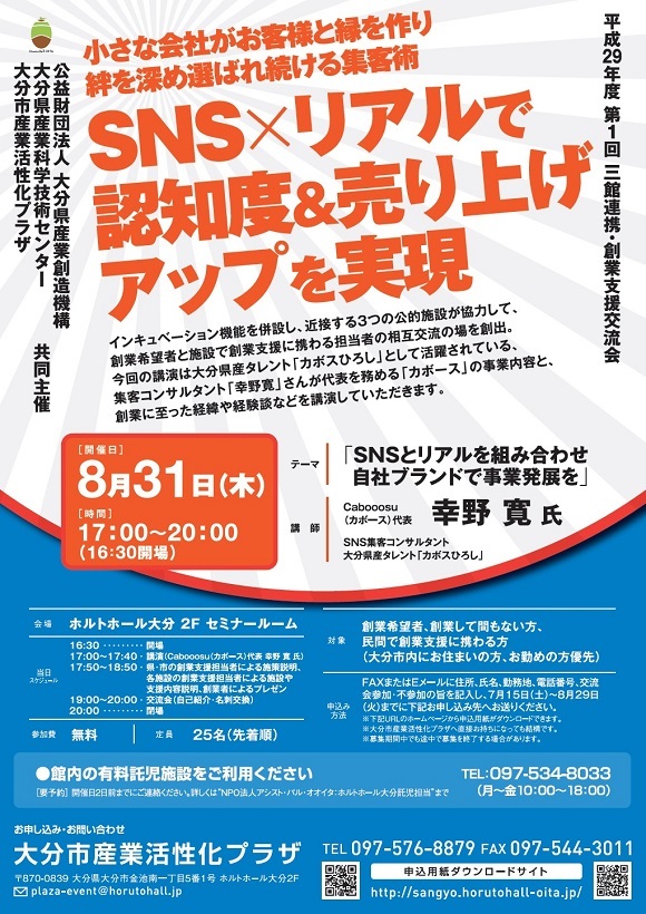 2017年8月31日に、Cabooosu代表の幸野寛がSNSとリアルで認知度&売上アップを実現するセミナーの講師を務めます。